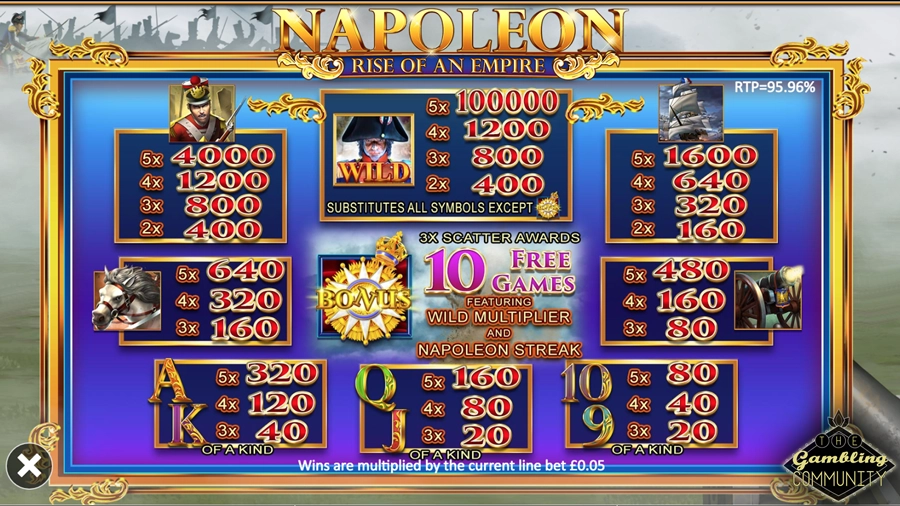 - High-Value Symbols: Napoleon himself acts as the highest paying symbol and the wild. He substitutes for all other symbols except the bonus, increasing your chances of hitting high payouts. Other high-value symbols include the soldier, horse, ship, and cannon.